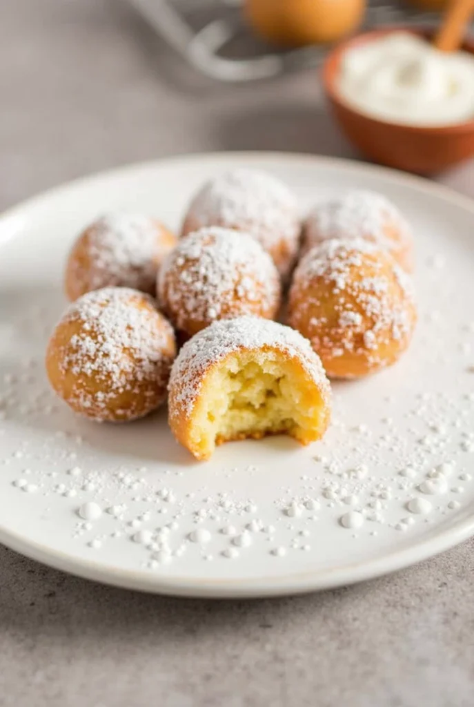 – Remove the bites with a slotted spoon and drain on a cooling rack or paper towels to remove excess oil. Dust generously with powdered sugar while warm.